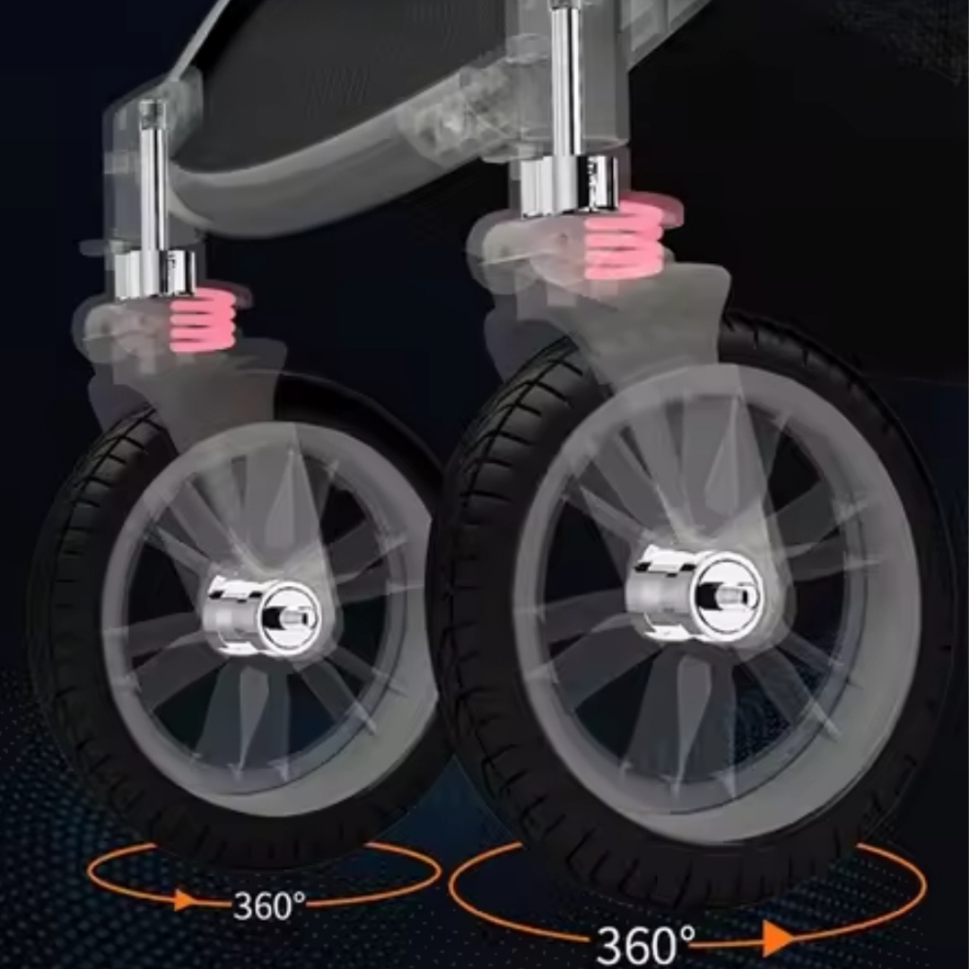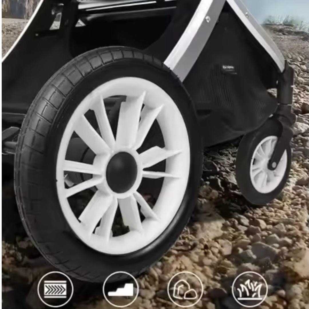 - Ruedas grandes con amortiguación, ideales para todo tipo de terrenos.